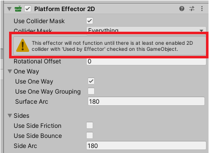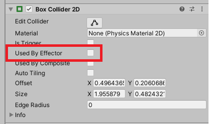 ※ 위와 같은 경고문이 출력되면 Boxcollider 2d 컴포넌트의 Used By Effector를 체크해주세요