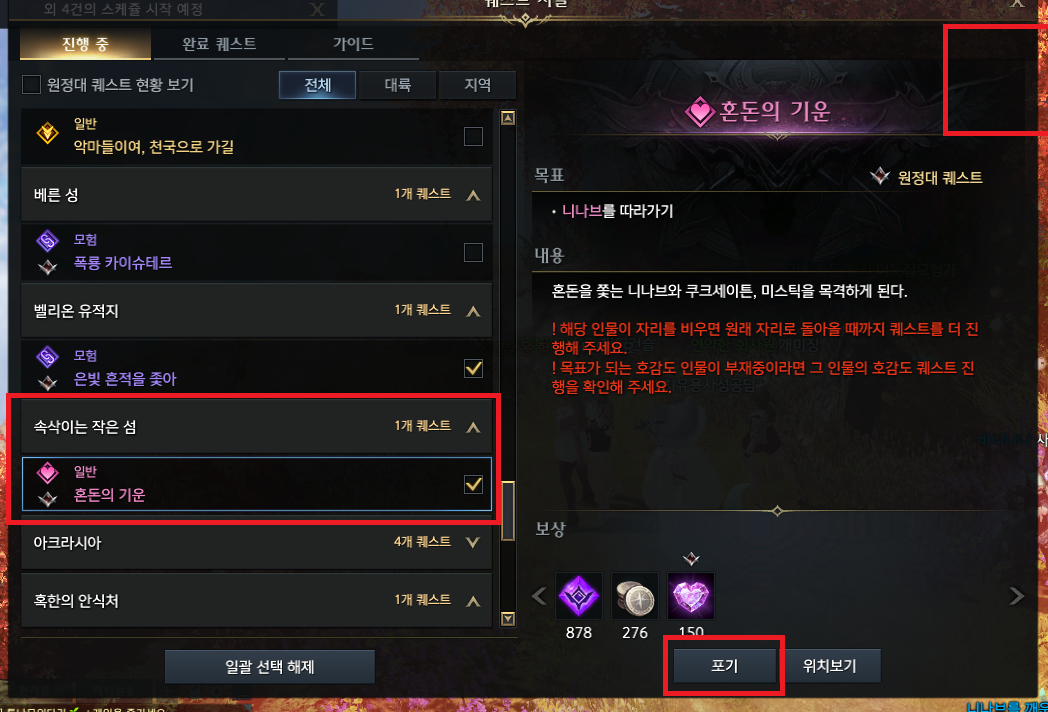 위의 퀘스트는 니나브의 호감도 퀘스트로 니나브 위치가 변경되므로 포기를 하고 니나브를 기존 위치로 돌려줍니다.