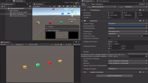 Depth 값을 변동함에 따라 카메라가 그려지는 순서 변경됩니다.