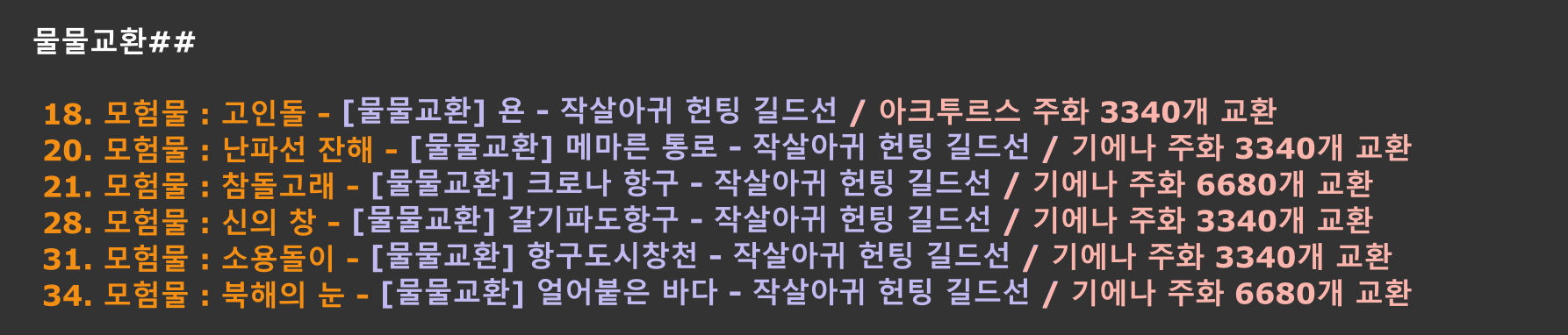 ※ 항해모험물 번호 / 획득처 / 획득 조건으로 축소 정리되어 있습니다.