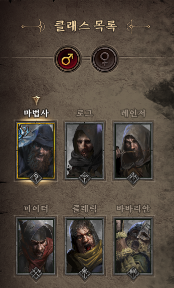 남,여 총 6개의 클래스가 존재하며 각 클래스마다 고유한 특전, 스킬들을 보유하고 있습니다.