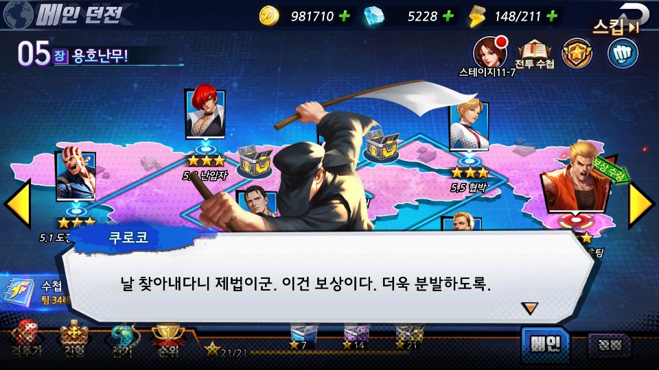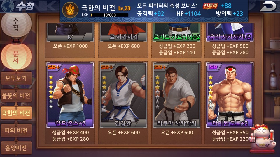 수집하는 욕구도 증가하며 불필요한 성장이란 게 없어서 모든 파이터를 수집하고 키우는 재미가 더 증가합니다.