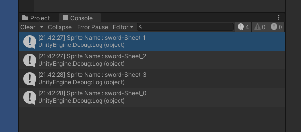마우스 버튼을 입력받았을 때 attackSprites [] 배열에 저장되어 있는 sprite를 애니메이션 속도에 맞게 변경하는 간단한 예제 결과 화면으로 sprite가 변경될 때마다 SpriteChangeCallback 함수가 호출되는 것을 확인할 수 있습니다.