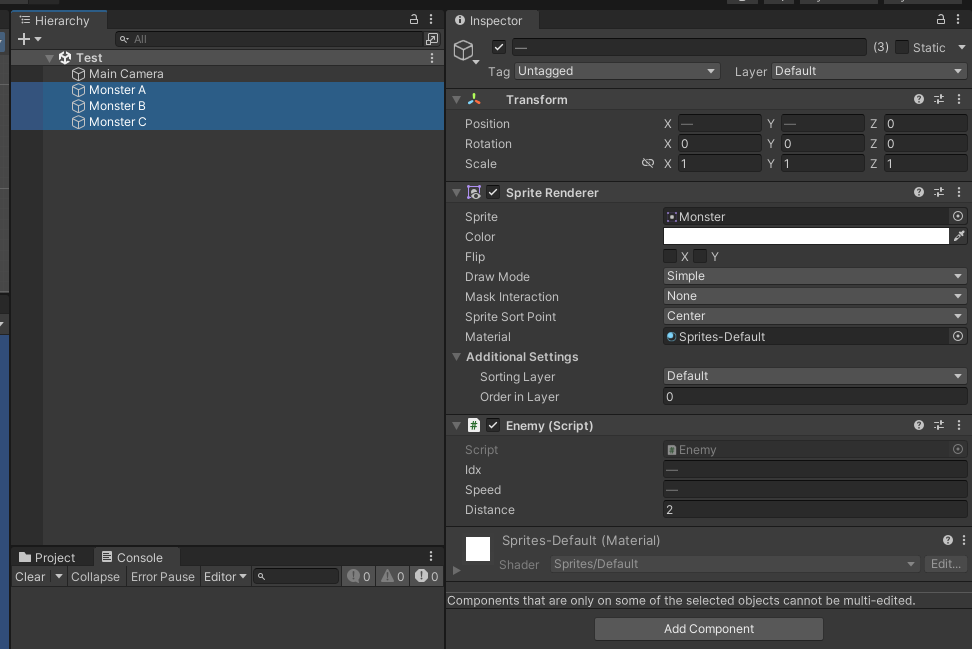 각 몬스터에게 동일한 스크립트를 제공하고 idx를 통해서 다른 방향으로 움직이도록 하였습니다.