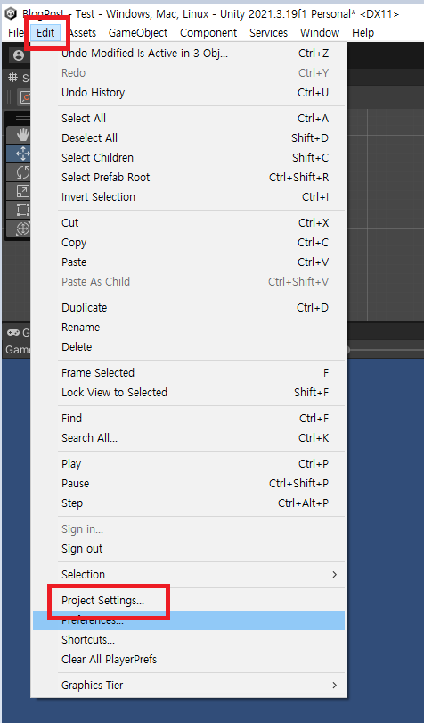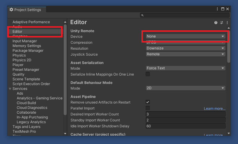2. Unity Edit > Project Settings > Editor 화면의 Device를 변경해 주시면 됩니다.