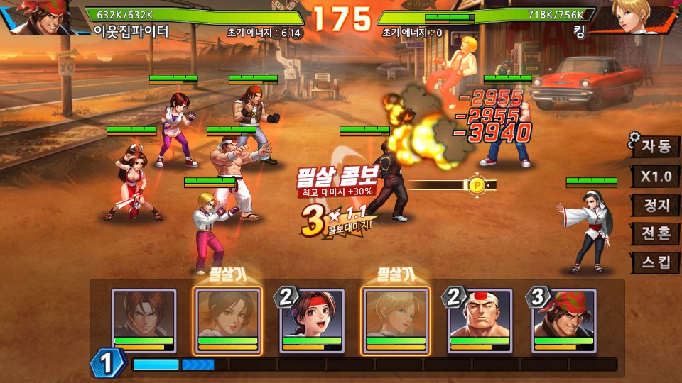 전투 방식은 하단의 게이지가 꾸준히 차오르고 파이터의 초상화를 클릭하면 초상화에 표시된 숫자만큼의