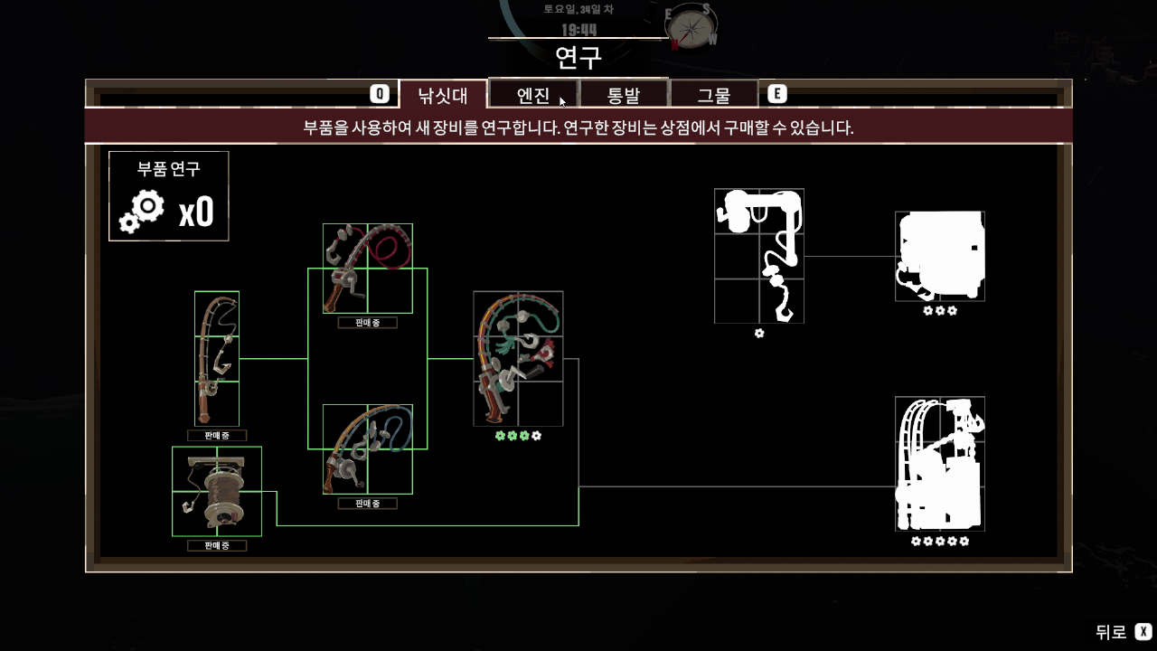 인양 또는 마을 주민이 주는 과제를 해결하여 연구에 필요한 연구 부품을 제공받아 더 높은 단계의 낚싯대, 엔진, 통발, 그물들을 연구하여 상점을 통해 구매가 가능합니다.