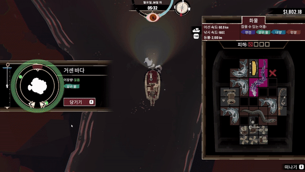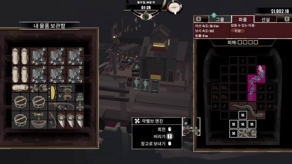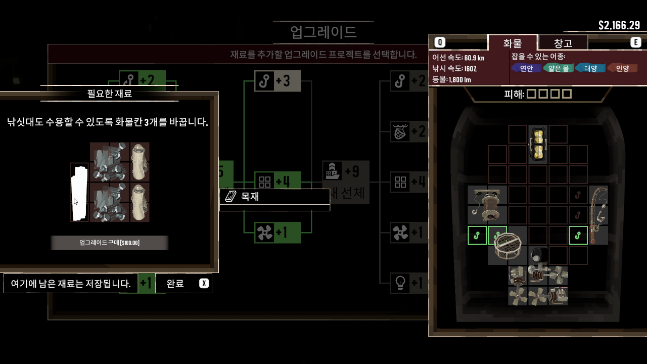 업그레이드를 통해 어선의 크기를 (인벤토리) 확장시키고, 커진 만큼 부품 또한 다양한 방식으로 교체하는 부분이 매력 있었습니다.
