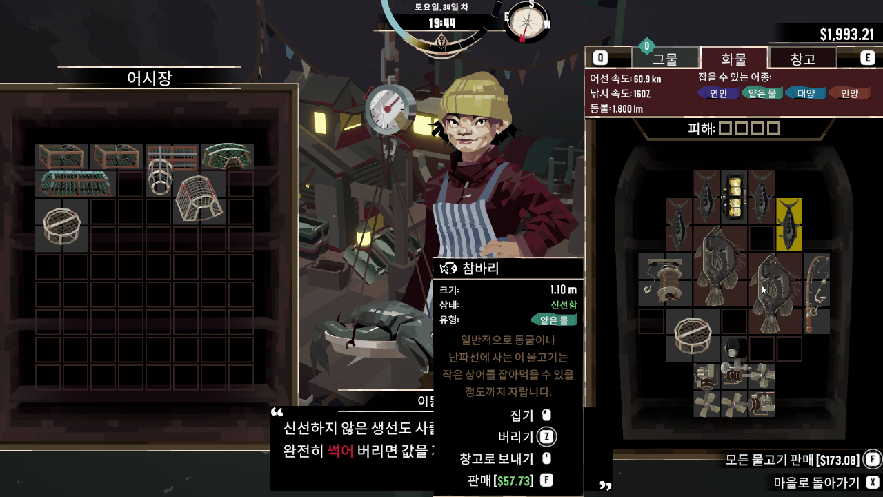 물품들을 보관할 수 있는 창고이며, 물고기 또한 보관이 가능하지만 신선도는 계속 떨어집니다.