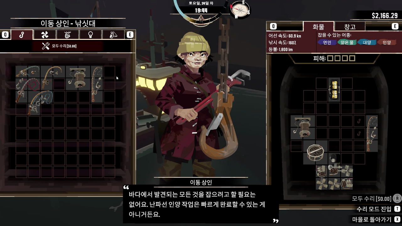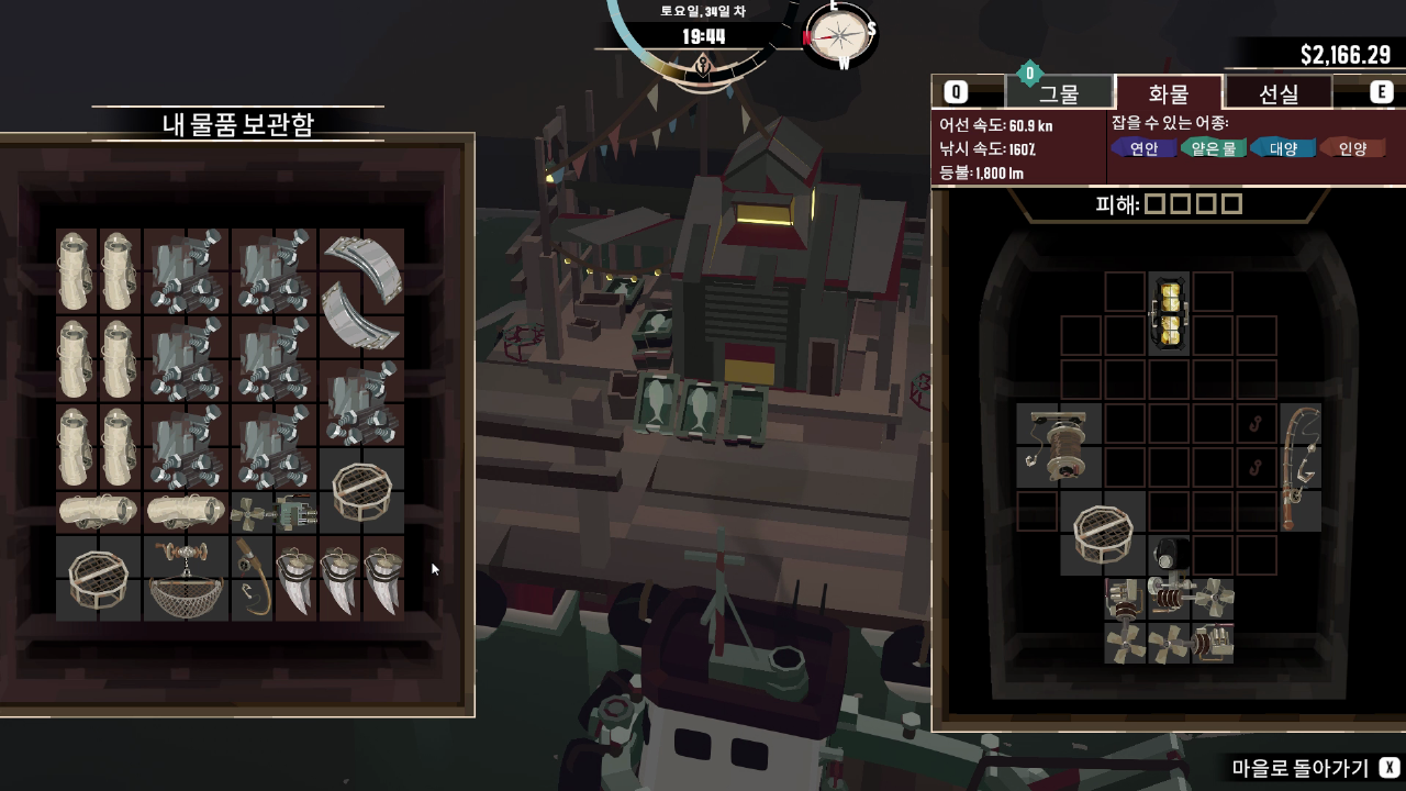 어선에는 낚싯대, 조명, 엔진 등이 필요한데 이런 장비들을 인벤토리 내에서 장착하는 특징이 있습니다.