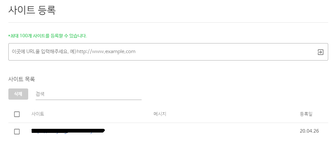 사이트 목록에 등록 신청한 URL이 표시되며 메시지란에 소유확인을 진행하라는 메시지가 출력됩니다.