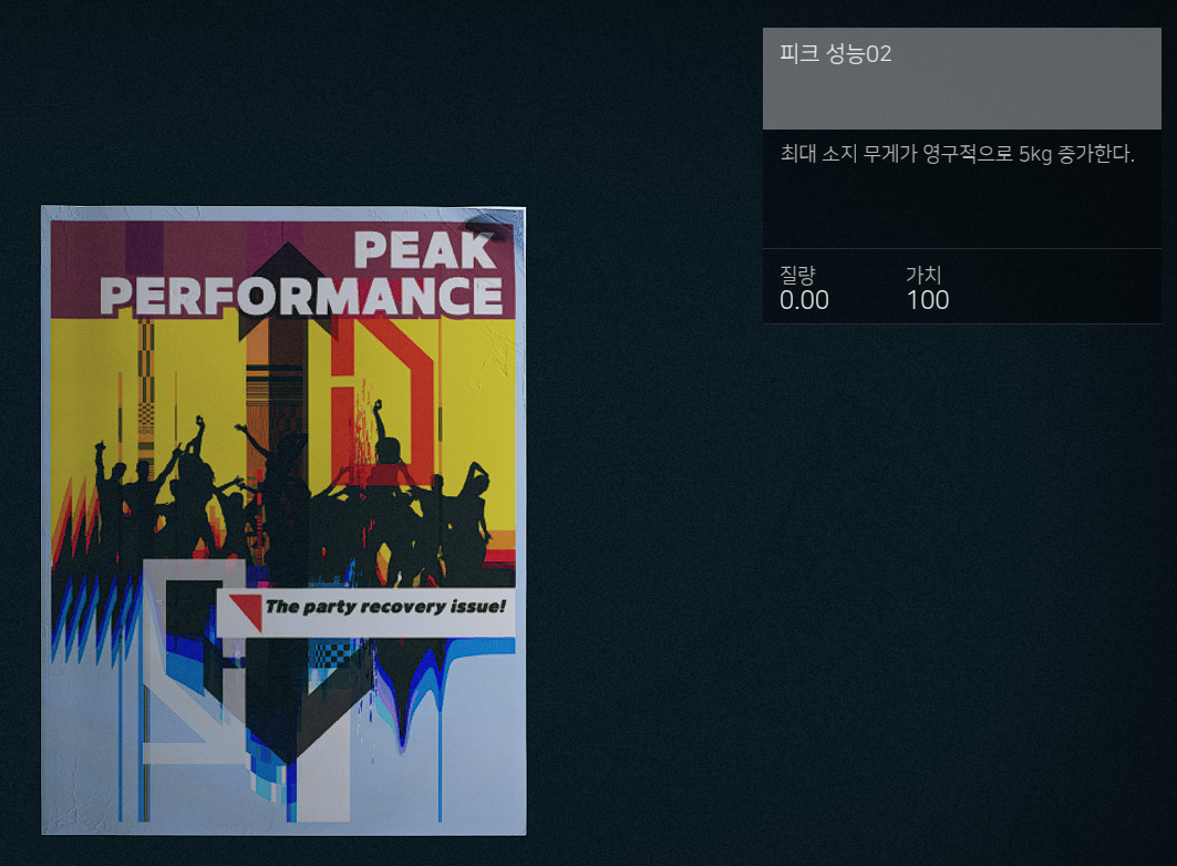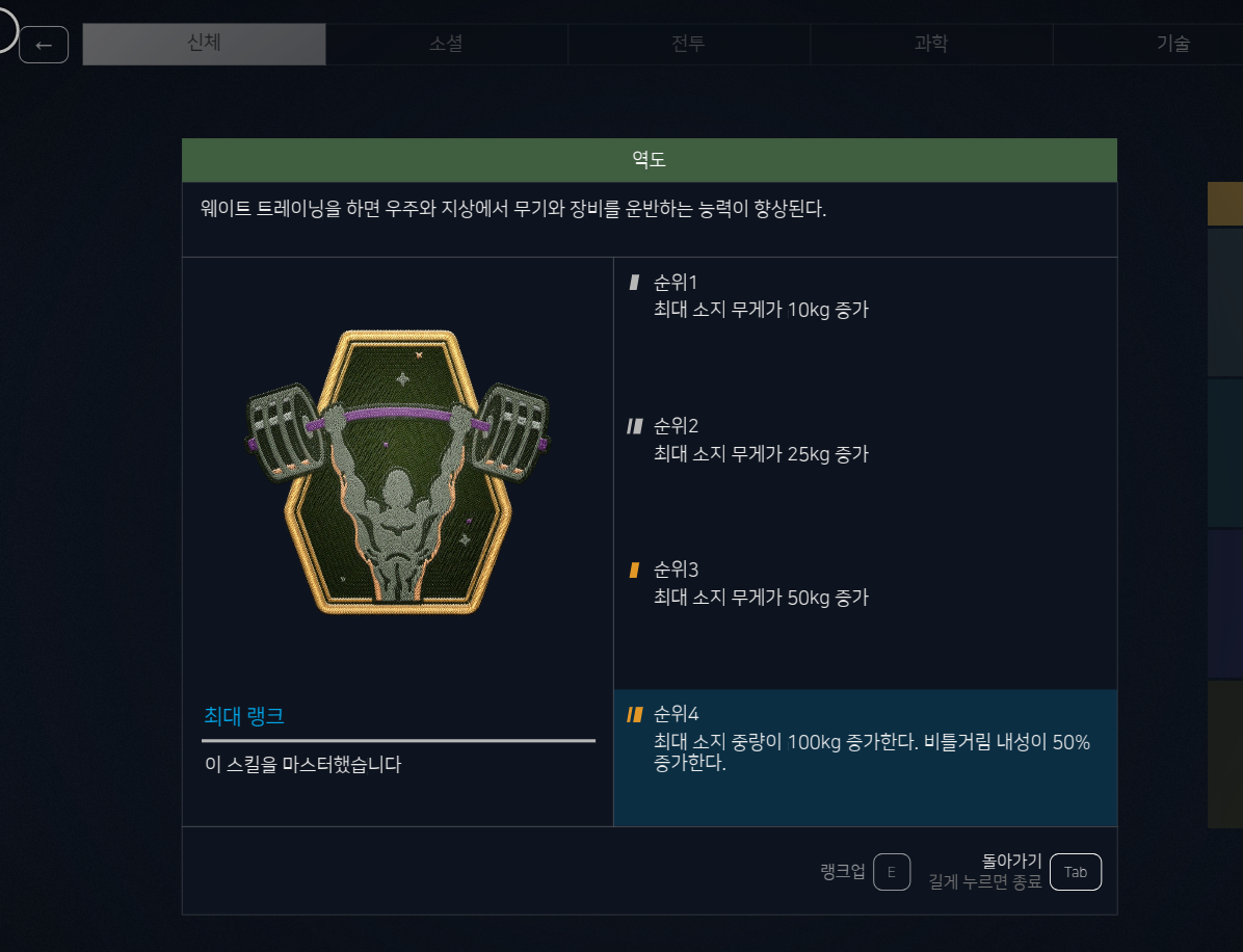 (신체 > 역도) 스킬은 플레이어의 최대 무게가 증가합니다.