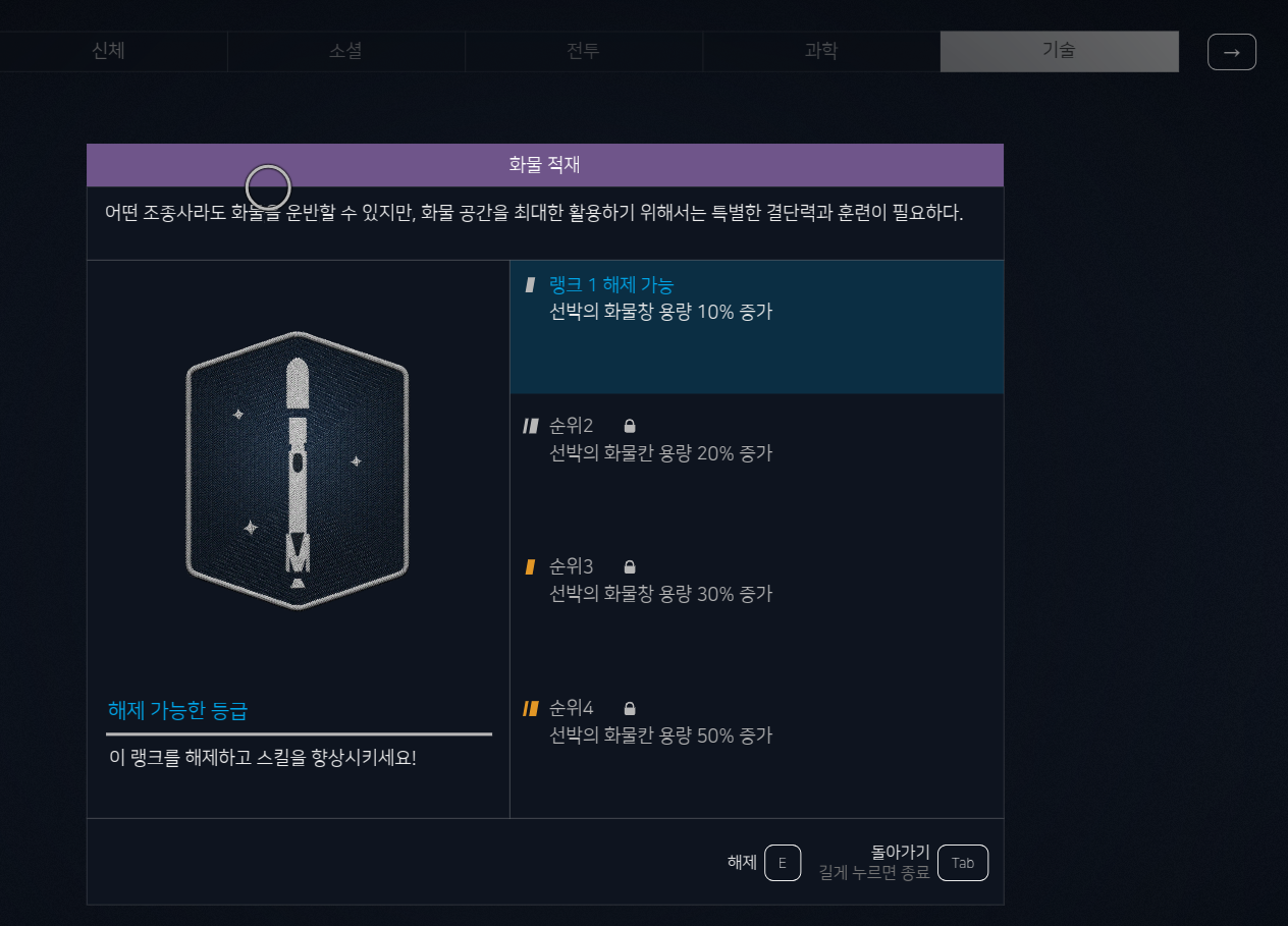 (기술 > 화물적재) 스킬은 화물창의 용량을 증가시킵니다.