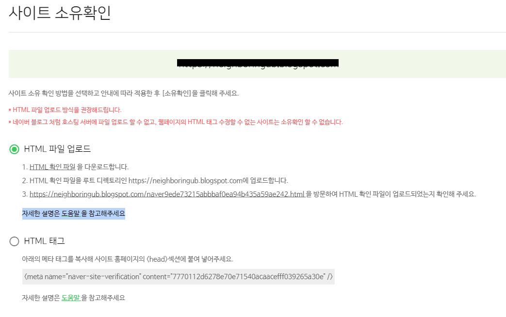 URL을 등록 신청하면 다음과 같은 2가지 방법을 활용하여 블로그 소유권에 대한 확인이 가능합니다.