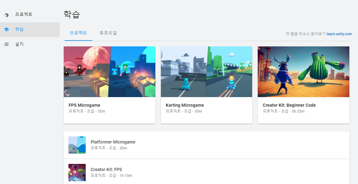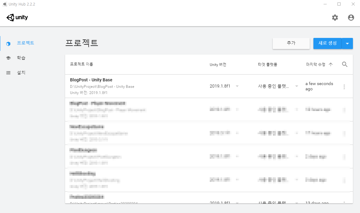 우측 버튼은 Unity Hub를 설치하고 Hub내에서 최신 Unity 버전을 추가 설치가 가능합니다.
