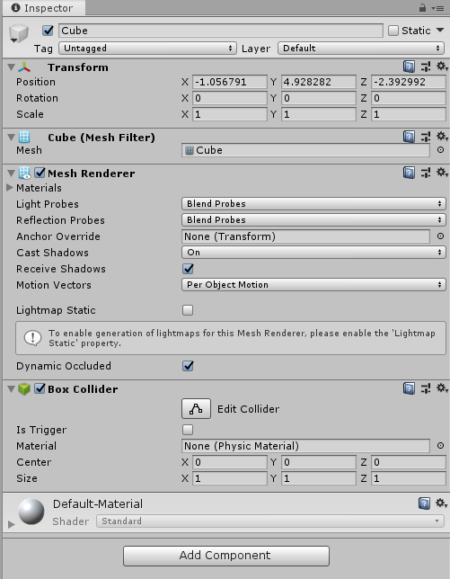 생성된 오브젝트를 선택하면 Inspector뷰에 다음과 같은 정보들이 보입니다.