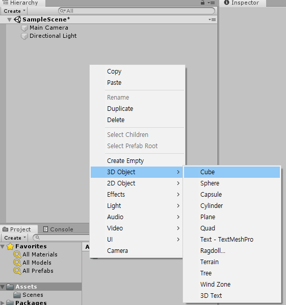 하이어 라키 창에서 오브젝트를 생성해줍니다. ( 3D Object > Cube )