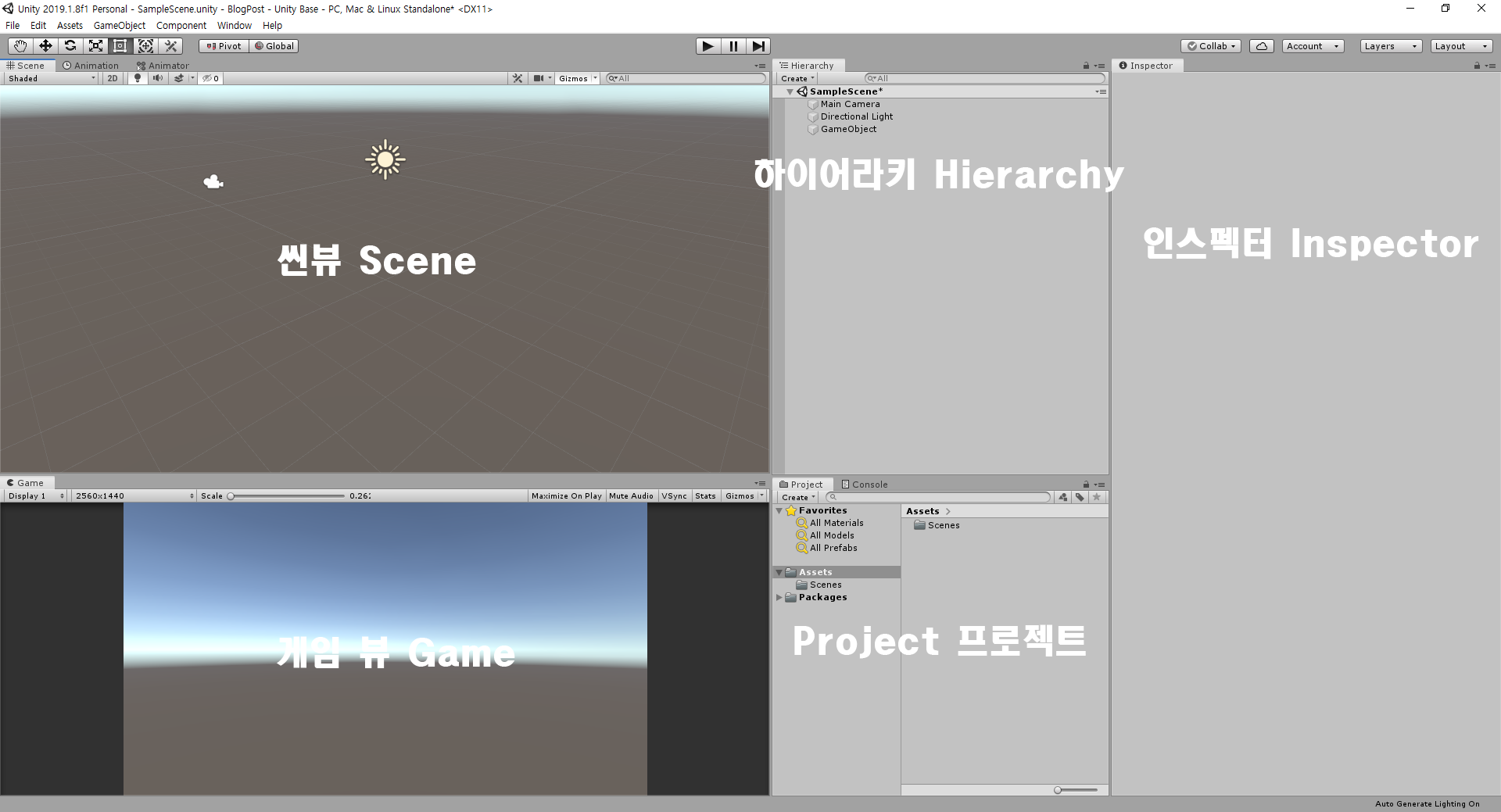 프로젝트 생성시 기본 오브젝트들로 구성되어있습니다. (ex)카메라 오브젝트)