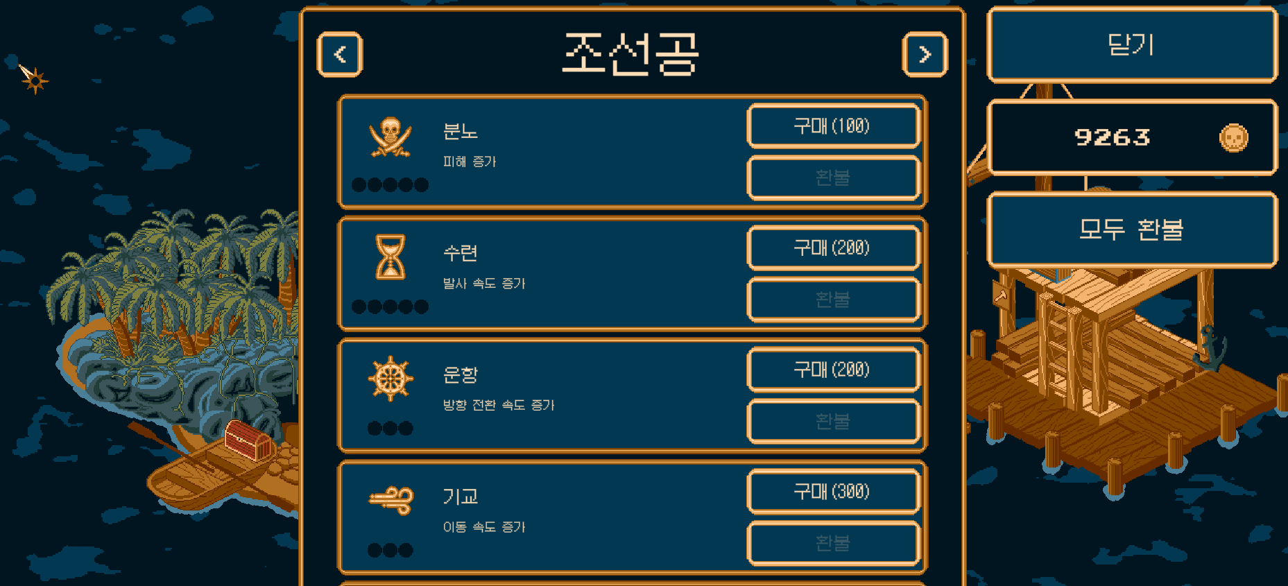 게임배경은 바다에서 해적무리와 바다괴물들을 처치하여 경험치를 얻어 무기와 보물들 획득하여 생존해 나가는 아주 심플한 방식의 게임입니다.