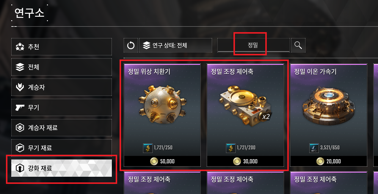 ※ 정밀 이온은 반응로 강화 재료로 최종 레벨, 최종 옵션템을 얻어야 쓸만할 거 같습니다.