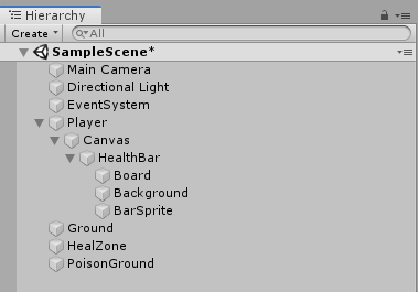 플레이어 오브젝트 안에 Canvas UI Image로 체력바를 구성하였습니다.