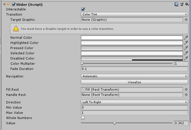 Fill 오브젝트는 슬라이더가 채워졌을 때 보이는 색상을 나타냅니다.