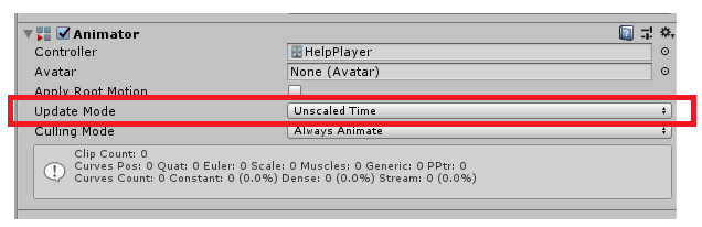 Animator 컴포넌트 안의 Update Mode를 Unscaled Time으로 변경해주시면