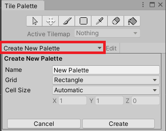 3. TilePalette창에서 새로운 New Palette를 생성합니다.