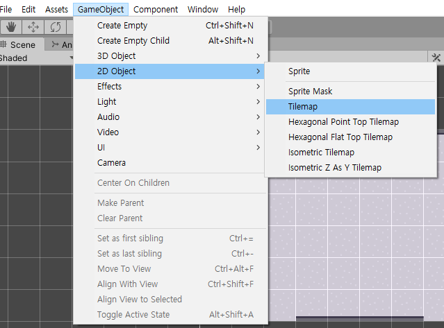 1. 유니티 안에서 2D Object > TileMap을 생성해줍니다.