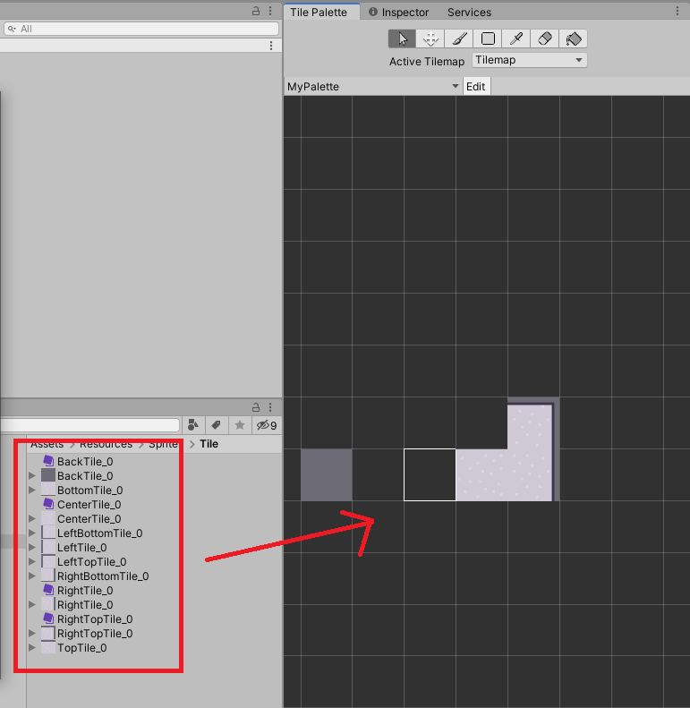 4. 생성한 Palette에 이미지를 드래그하여 Tile Asset을 생성해줍니다.