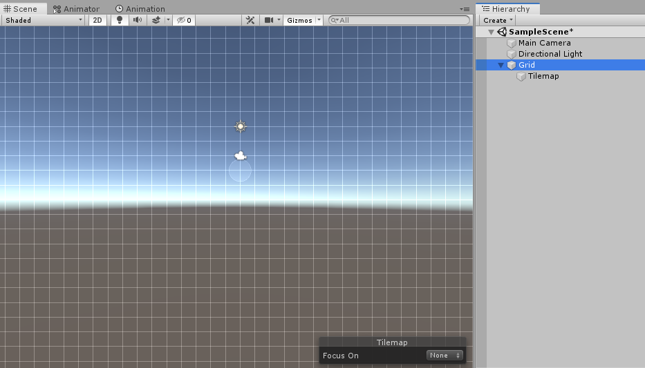 ※ TileMap오브젝트를 생성하면 아래와 같이 격자가 보이게 되며 해당 영역에 등록한 TileAseet을 이용하여 Tile을 배치할 수 있습니다.