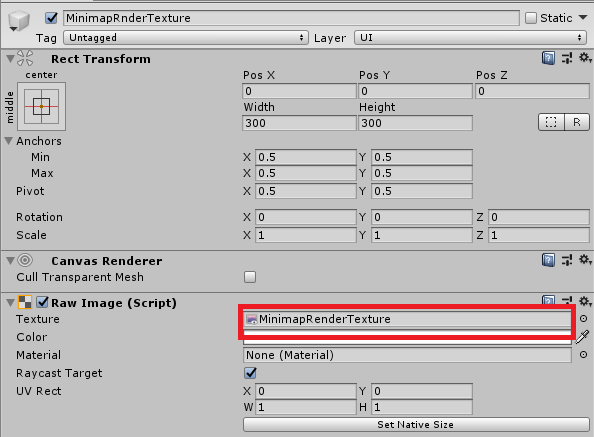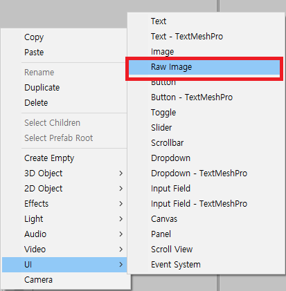 5. Ui > raw Image 생성, 3번에서 생성한 RenderTextture 삽입