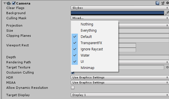 2. Main카메라의 Culling Mask에서 방금 추가한 Minimap을 제외시킨다.