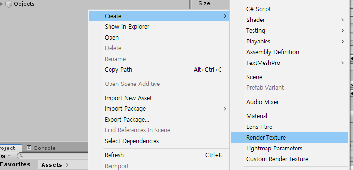 3. 프로젝트 창 Create > RenderTexture를 생성합니다.