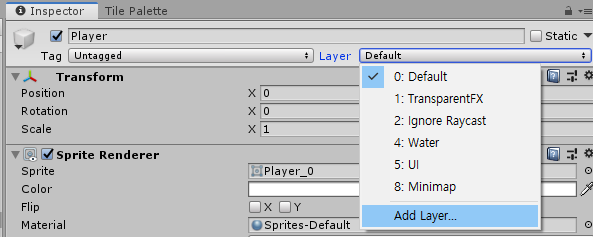 1. 인스펙터 창 우측 상단에 Layer를 추가한다.