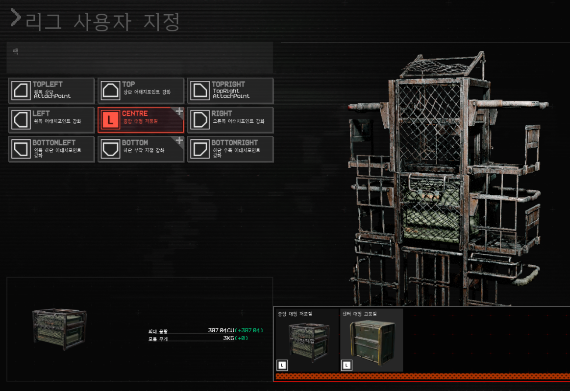 리그 사용자 정의를 통해 순정 리그에서 고품질의 파츠로 변경이 가능합니다. (전투 로드아웃 > RIGS > 사용자정의)