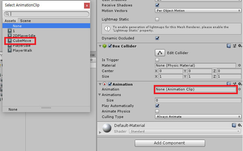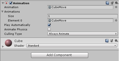 3. 큐브 오브젝트에 Animation Component를 추가한다.