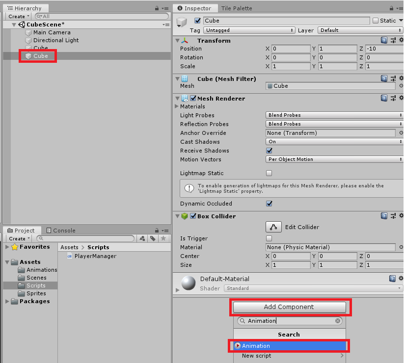 3. 큐브 오브젝트에 Animation을 추가한다.