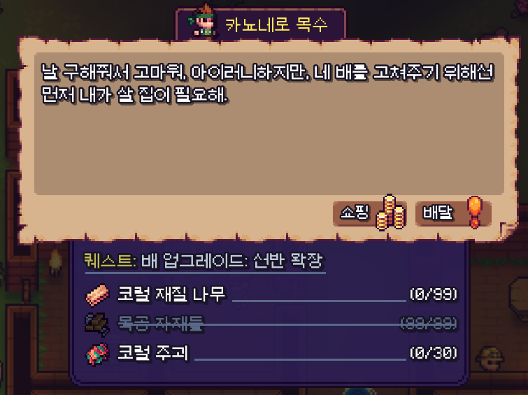 난파선 수리를 위해 필요한 재료 중 목공자재는 목수 NPC 본인이 돈을 받고 팔고 있습니다.
