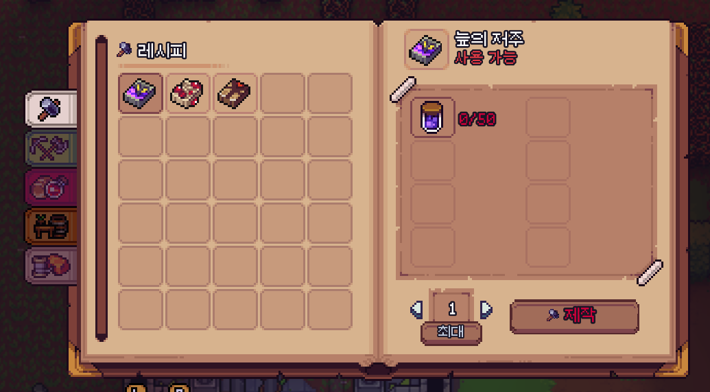 ※ 레시피는 해당 재료를 획득한 이후부터 제작이 가능합니다.
