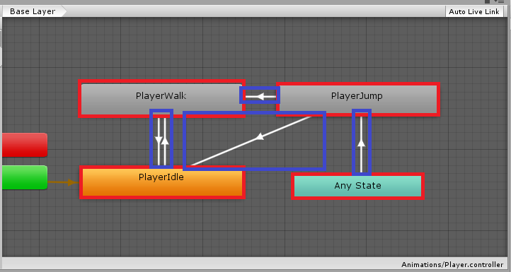 빨간색으로 표시 된표시된 것은 각각의 모션 Animation Clip들이며 파란색으로 표시된 것은