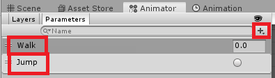 이미지에 보이는 + 통해 Float형 Walk, Tirigger형 Jump Parameter를 생성해준다.