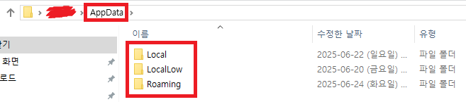 ※ 검색은 appdata가 나와있는 경로 우측에 입력칸이 있습니다.