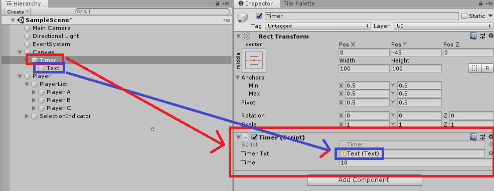 3.. Timer 오브젝트에 Timer 스크립트를 할당합니다.