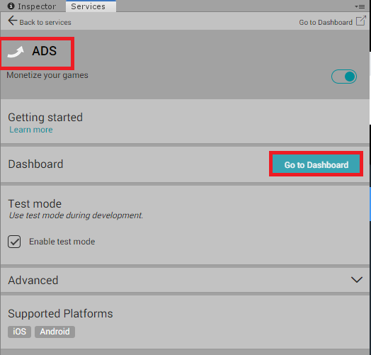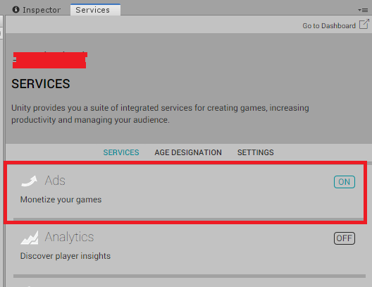 1. 유니티 Service Tab > UnityAds - Dashboard를 클릭합니다.