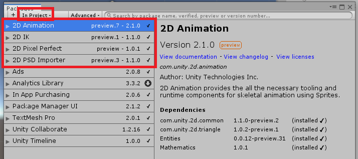 2D Animation 패키지는 스프라이터의 골격을 생성하고 편집할 수 있는 패키지입니다.