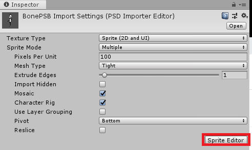 프로젝트 창의 PSB 파일을 선택하고 인스펙터에 정보가 보이면 Sprite Editor를 선택합니다.
