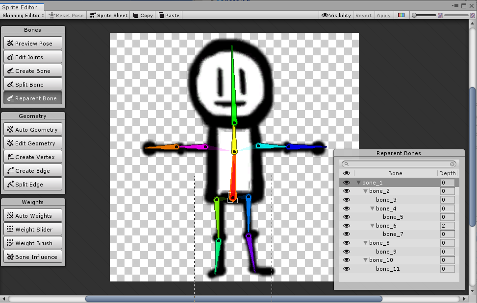 Skinning Edit를 선택하면 스프라이트의 뼈대를 생성 편집 가능합니다.