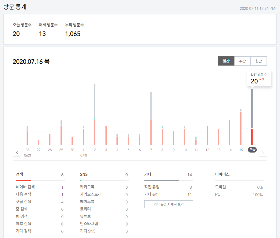 위의 화면은 티스토리 관리자 화면의 그래프 상단에 방문통계를 누르면 보실 수 있는 화면입니다.