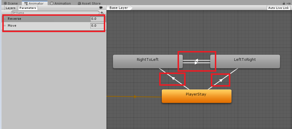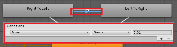 float형의 Reverse, Move 2개의 파라미터를 생성하였으며 위의 이미지와 같이 Transition을 설정하였습니다.